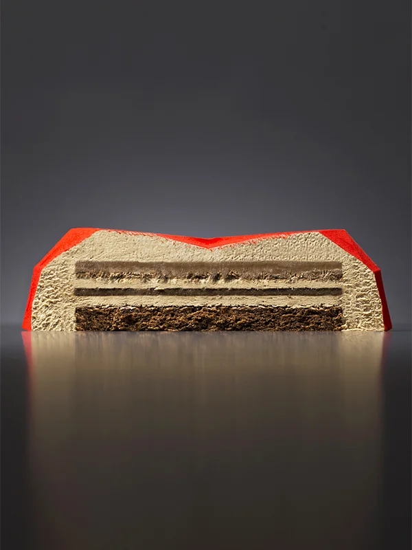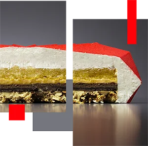 Groene scheuten in de woestijn wijzen op een verrassing onder het oppervlak om van te watertanden. Een verrassing gevuld met mousse, geblend met een aangename frambozen en zwarte bessen confituur, gewikkeld in een zandkoekjesdeeg en dat allemaal rustend op een lichte biscuit.